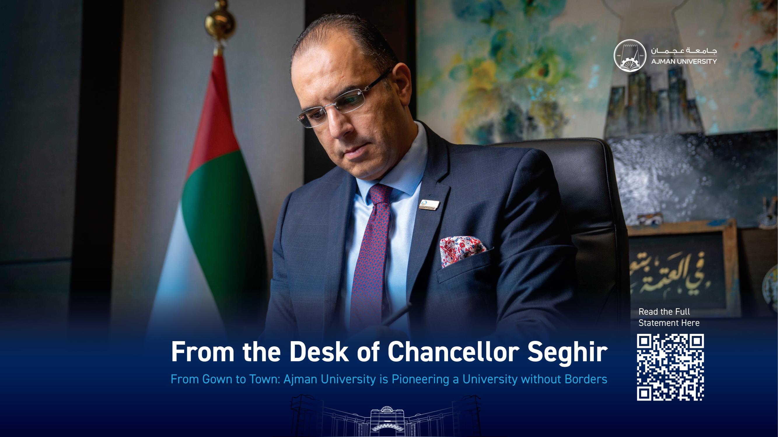 We’re pleased to share the May 2025 edition of From the Desk of Chancellor Seghir, featuring a powerful reflection titled: “From Gown to Town: Ajman University is Pioneering a University without Borders.” In this month’s statement, Chancellor Seghir shares how Ajman University is advancing a bold vision of Edupreneurship, becoming a true University without borders. By connecting academia, industry, and government, AU is helping co-create a sustainable and inclusive knowledge economy. He outlines how the Gown to Town strategy, through CXO Connect forums, executive roundtables, and real-world partnerships, is translating this vision into impactful action. |