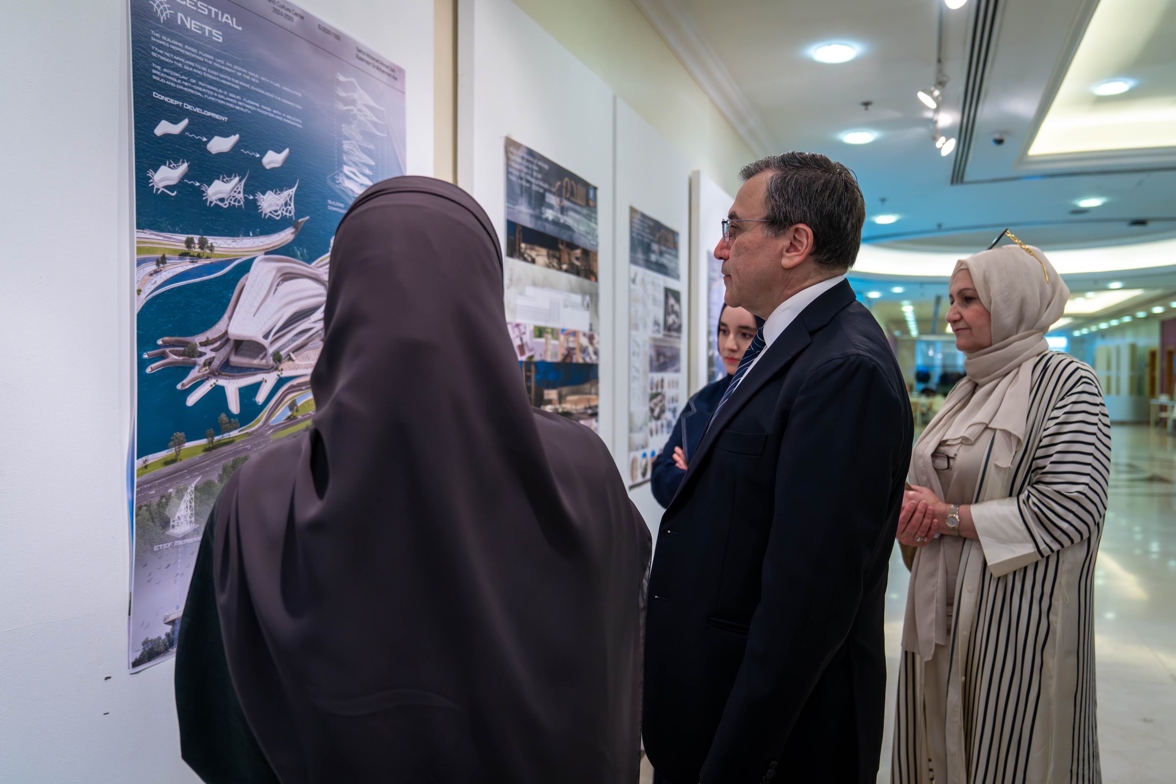 The College of Architecture, Art and Design participated in the exhibition held alongside the Emirates Green Building Council’s 14th Annual Congress, under the theme “Mission to 1.5°C: Be Bold on Buildings.” The Architecture Department, led by Dr. Muna Salameh, showcased innovative student work focused on climate-resilient architecture, including sustainable school designs and shaded pavilions tailored for the UAE’s hot climate. Dr. Muna supervised students Farah and Jana, who presented their proposals with creativity and professionalism, reflecting a deep understanding of environmental challenges and future-oriented design. This participation reinforces Ajman University’s ongoing role as a Knowledge Partner of the Emirates Green Building Council and its commitment to advancing sustainability in the built environment. |