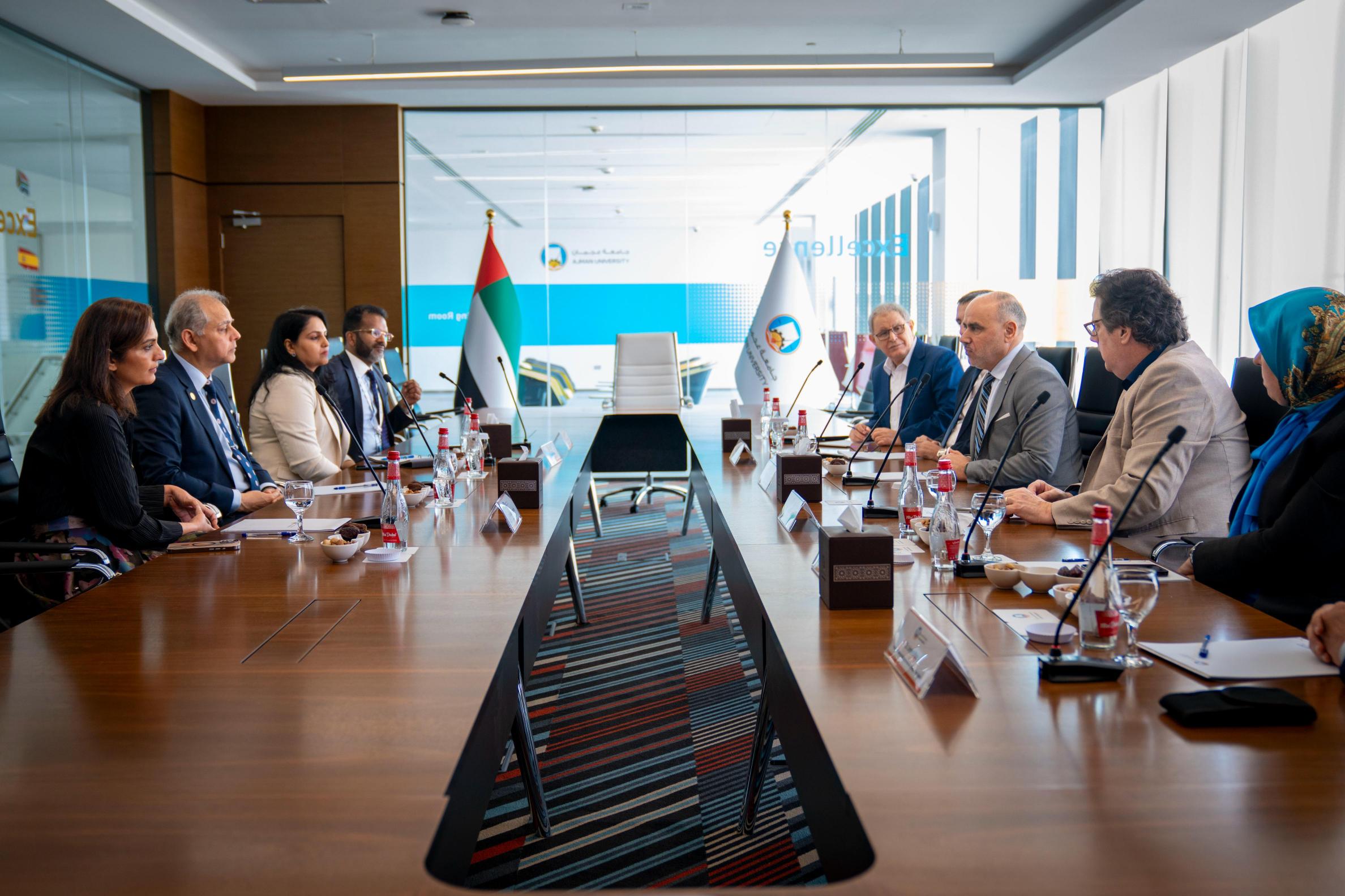 Prof. Khaled Assaleh, Vice Chancellor for Academic Affairs, welcomed a delegation from NMC Healthcare that included Dr. Raashid Shahbazi, Regional Medical Director for Sharjah and the Northern Emirates, and Dr. Kalpana Krishnareddy, Deputy Medical Director. The visit also included participation from Ajman University representatives, Dr. Akram Ashames, Assistant Vice Chancellor for Academic Affairs; Prof. Allen Guy Ross, Dean of the College of Medicine; Prof. Abeer AlGhananeem, Dean of the College of Pharmacy and Health Sciences; Prof. Salem Abu Fanas, Dean of the College of Dentistry; and Dr. Amer AlAni, Head of Clinical and Medical Education in the College of Medicine. The meeting focused on strengthening collaboration between Ajman University and NMC Healthcare in academic development and clinical training. |