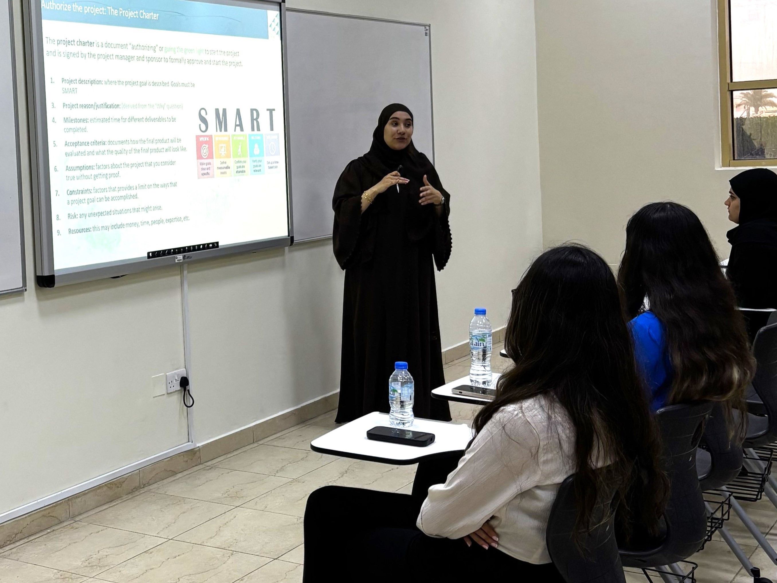The Department of Management and Marketing at the College of Business Administration, in collaboration with INJAZ UAE, hosted a workshop on “Project Management” delivered by Ms. Raween Osama Abdou, Marketing and Publishing Associate at ELF Publishing. The session introduced students to the fundamentals of project management, including planning, execution, risk management, and communication. Drawing from her industry experience, Ms. Abdou shared practical insights that help students apply project management concepts effectively in academic and professional settings. |