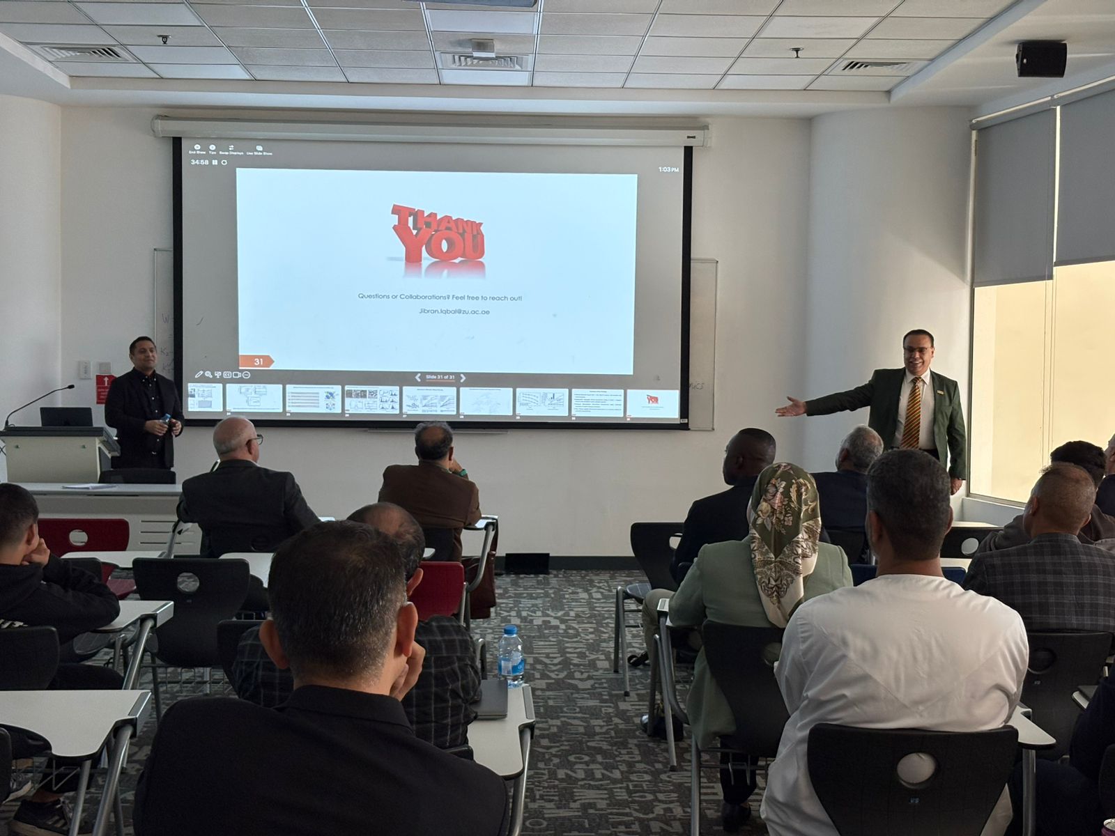 The College of Law, in collaboration with Al Tamimi & Company, organized a training workshop titled “Civil Litigation Procedures.” Delivered by Senior Legal Consultants Majd Baroudi and Nasser Yahya, the session introduced students to practical aspects of civil litigation, best legal practices, and courtroom procedures, while offering them direct interaction with legal experts to strengthen their knowledge and professional skills. |