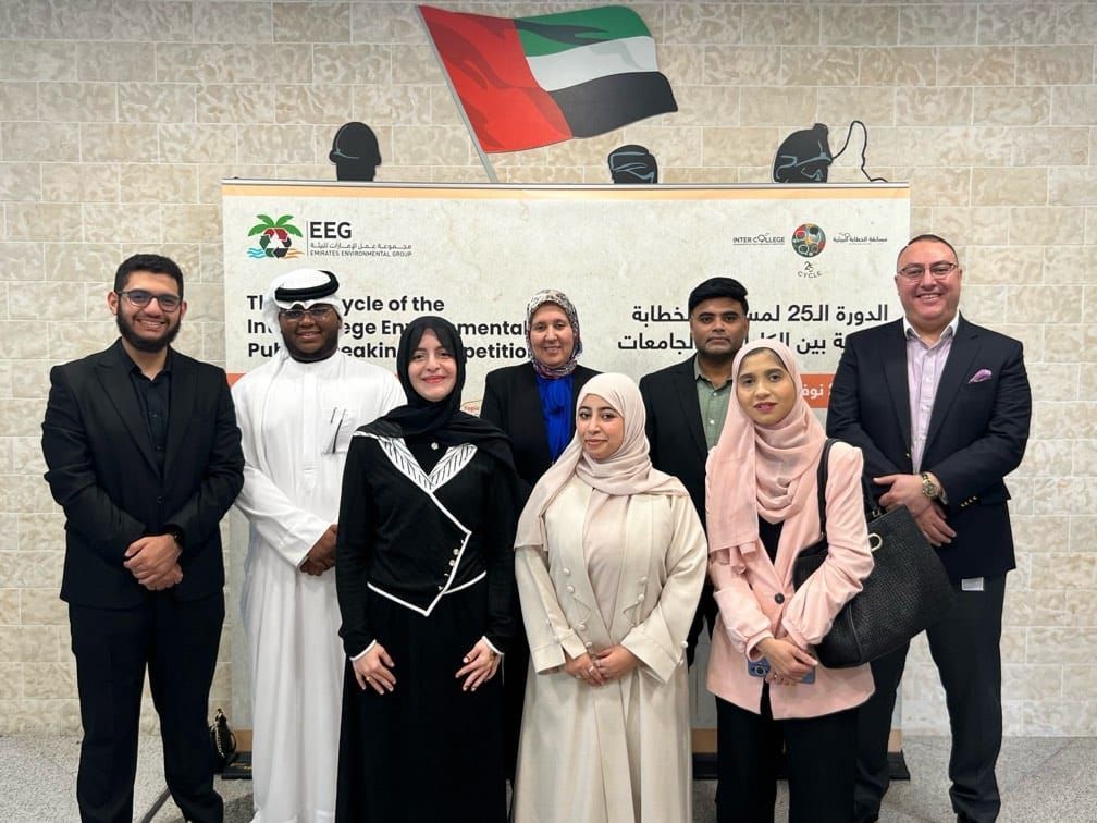 Ajman University students from the College of Dentistry, College of Engineering and Information Technology, and College of Pharmacy and Health Sciences participated through the Office of Sustainability in the Emirates Environmental Group (EEG) Inter-College Environmental Public Speaking Competition held in Dubai. The competition focused on strengthening students’ public speaking skills while addressing various environmental topics. Participants delivered presentations that reflected their awareness of sustainability issues and their ability to communicate them clearly. This participation supports the Office of Sustainability’s efforts to promote environmental awareness and develop students’ leadership and communication skills, creating a positive community impact. |