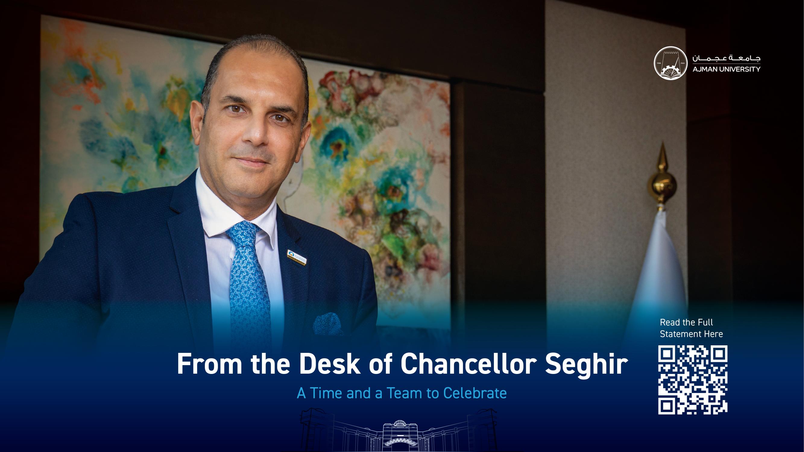 In his February 2026 statement, Chancellor Seghir recognizes the collective efforts that continue to drive Ajman University’s progress. He acknowledges the contributions of faculty, administrators, student services teams, facilities staff, and colleagues across the University whose dedication supports advances in global rankings, research activity, academic programs, and the overall student experience. The statement highlights the shared professionalism and commitment that define the AU team and emphasizes the values of care, responsibility, and mutual respect that sustain the University and prepare it for the future. |