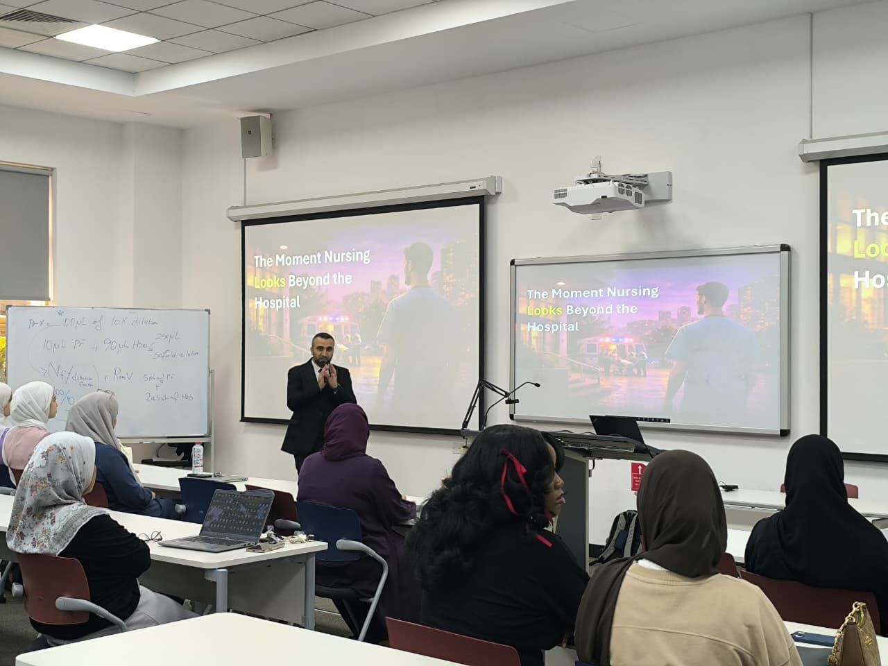 Nursing students attended a session titled “Career Beyond Hospitals: Exploring Prehospital Care for Nursing Students,” delivered by Baha Mustafa, Operation Manager at National Ambulance. Through real case scenarios, they explored the differences between nursing and paramedic roles in prehospital care, learned about EMT and Paramedic certification pathways in the UAE, and engaged in an interactive Q&A session that expanded their understanding of career opportunities beyond hospital settings. |