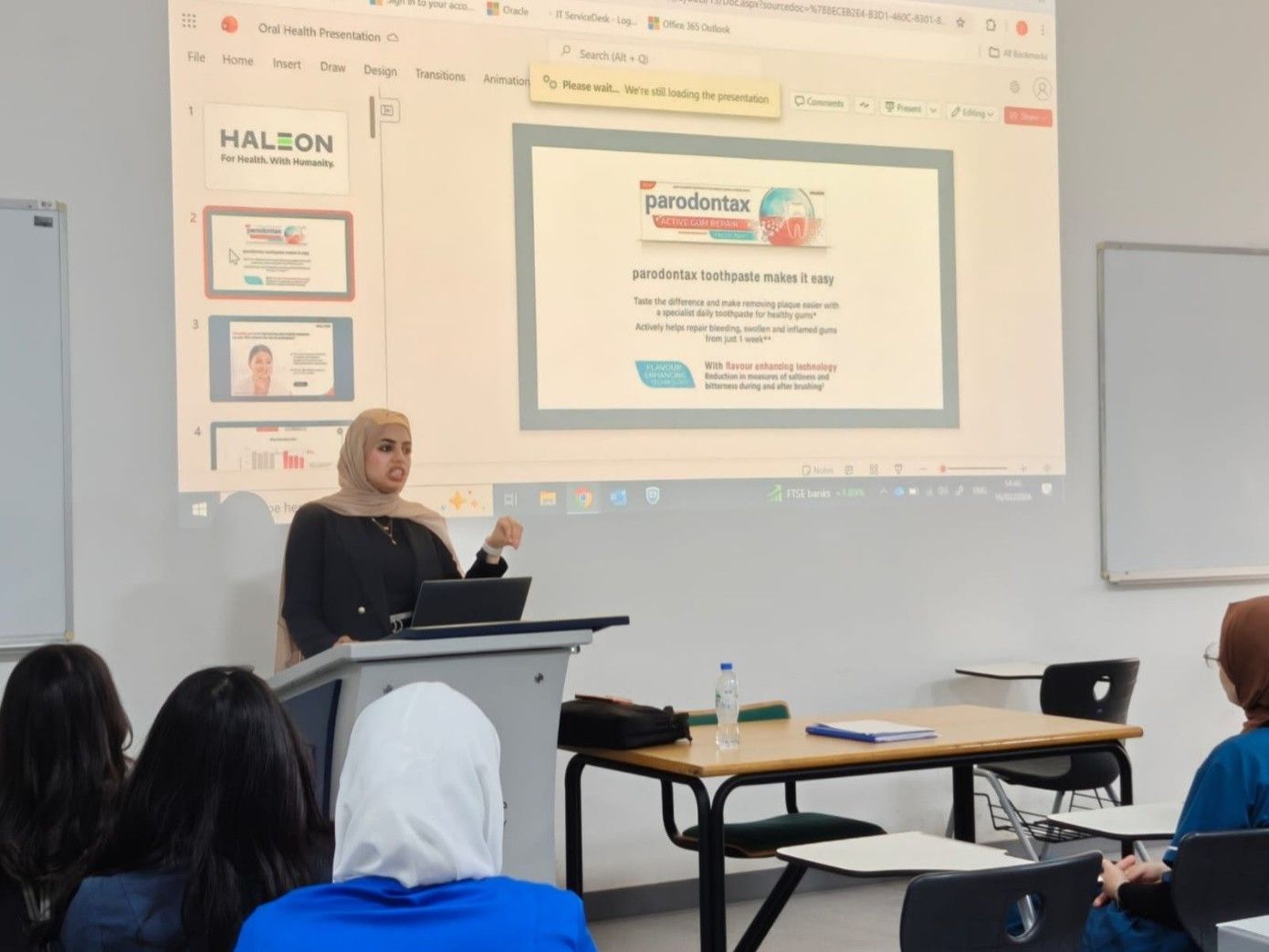 Graduating dental students attended an engaging session delivered by alumna Zainab Mohammed Hassan, a 2019 graduate of the College of Pharmacy and a Marketing Specialist at Haleon. During the session, students explored key healthcare products, gained industry insights, and connected their academic knowledge to real-world practice through active discussion and interaction. |